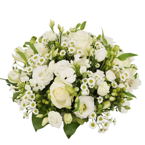 Bloemstuk in het wit rond opgestoken. Biedermeier witte tinten laten bezorgen in heel Nederland.