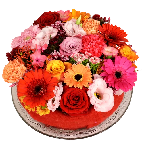 Bloemen in een taart. Deze bloementaart is gemaakt met alleen bloemen. ( niet eetbaar) Prachtige kleuren rood roze en oranje. Bestel eenvoudig