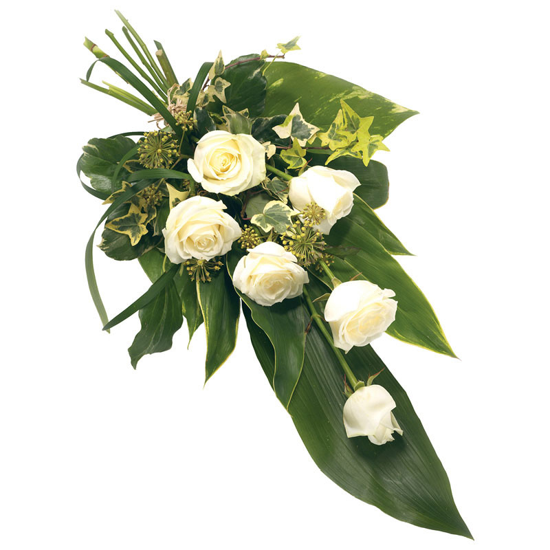 Stuur dit mooie rouwboeket met witte rozen en seizoensgroen als symbool van je liefde en medeleven. Geef een eerbetoon aan je geliefde, ongeacht je budget.