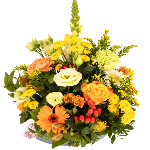 Bloemstuk klassiek ook wel Millefleur genoemd. Rond en hoog opgestoken bloemen in een pot of schaal.