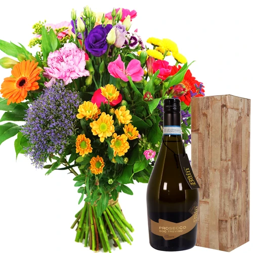 Boeket in bonte kleuren en een heerlijk prosecco samen bestellen en bezorgen. Een mooi betaalbaar cadeau voor vele gelegenheden. Thuiswinkel Lid.
