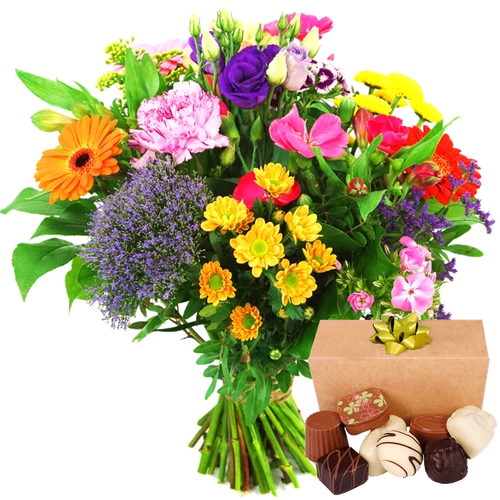 Bloemen boeket in allerlei kleuren vormt één bont geheel. Dit kleurrijke boeket bloemen wordt samen bezorgd met heerlijke bonbons. Bestel eenvoudig!