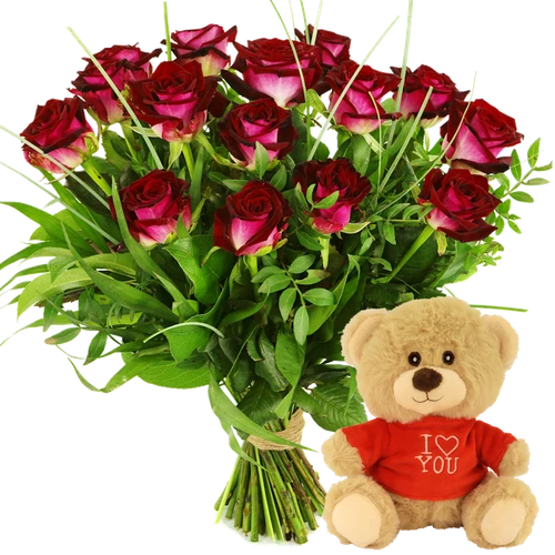 Rode rozen bezorgen samen met een witte knuffel I love you met rood hart. 6 dagen per week bezorgd in Nederland.