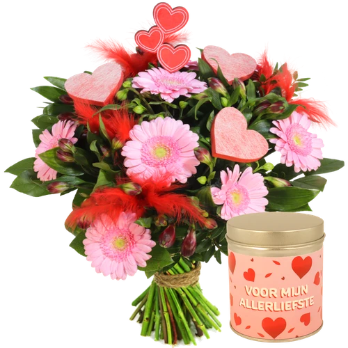 Een liefdes boeket met hartjes en een blikje met hartjes snoep met de tekst” Voor mijn allerliefste” Prachtige combinatie voor jouw Valentijn