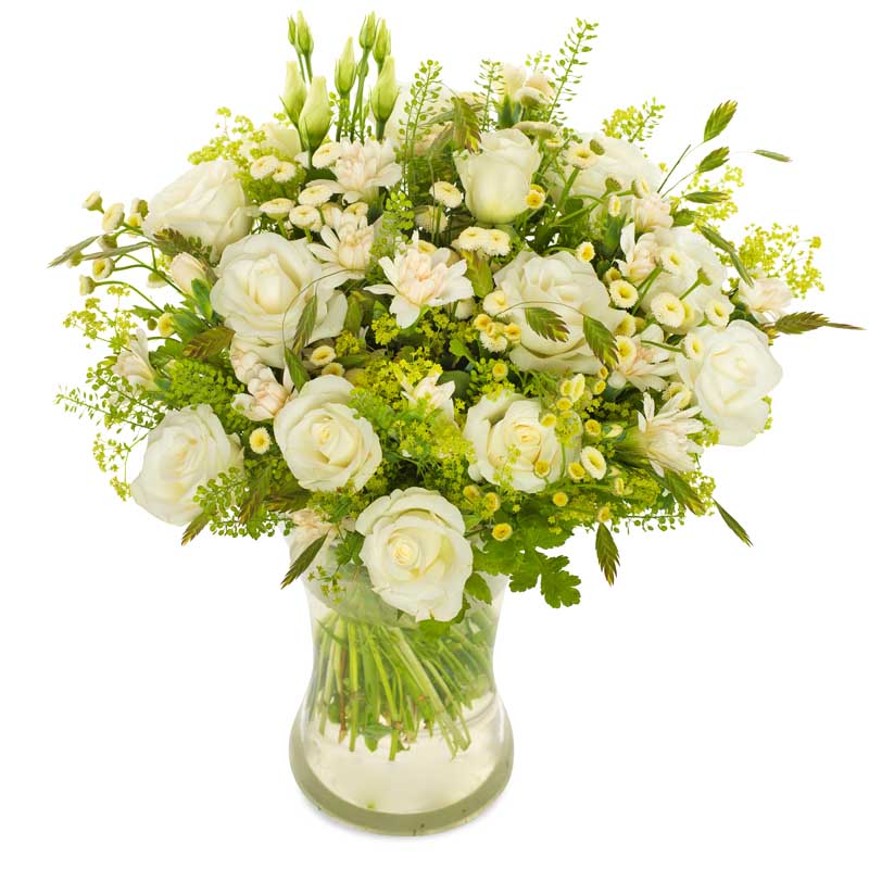Met deze elegante combinatie van wit en groen geef je een boeket in stijl. Een chique boeket met bloemen van de beste kwaliteit, met liefde geselecteerd door een lokale bloemist zodat je eerbetoon zowel oprecht als budgetvriendelijk is.