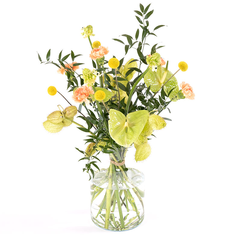 Een echte blikvanger! Aronskelken en anjers in levendig groen, geel en oranje maken dit veldboeket extra speciaal. Zo’n uitzonderlijke schoonheid tegen een lage prijs is een win-win voor iedereen.