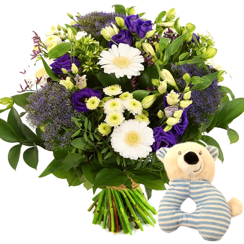 Een blauw paars wit geboorte boeket voor een jongen en een leuke rammelaar een prachtig kraamcadeau. Snel bezorgd binnen 24uur. Makkelijk bestellen.