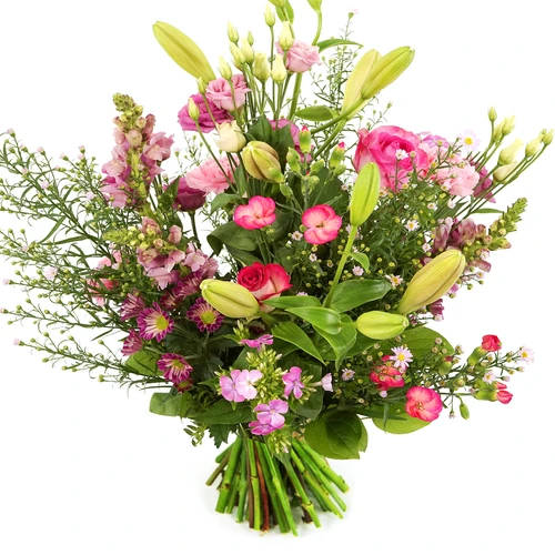 Roze bloemen in een geplukt boeket, elke bloem komt tot zijn recht in de geplukte roze boeket. Bestel nu !