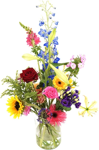 Geplukte seizoen bloemen zo van het land of uit de tuin, geschikt in een glazen melkbus vaas en compleet bezorgd aan huis of bij bedrijf, ziekenhuis etc. in heel Nederland.