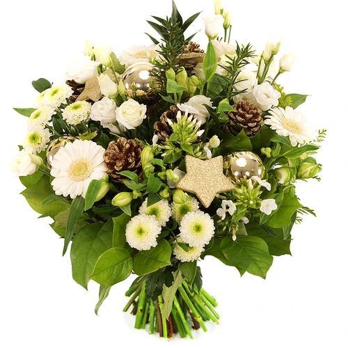 Witte kerst bloemen samen gouden kerst materialen gecombineerd. Vers gemaakt in eigen bloembinderij. Bezorging 24/7. Thuiswinkel Lid. Versgarantie. etc.