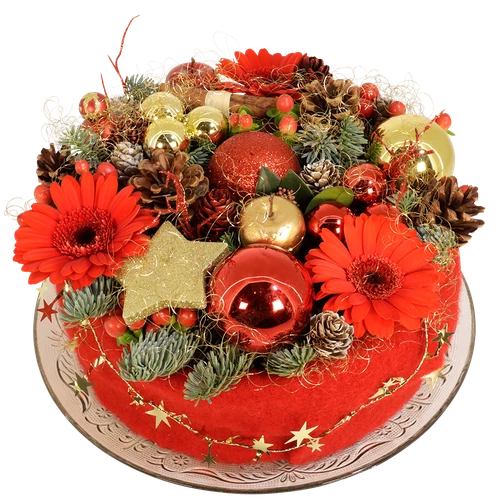 Kerst bloemen opgemaakt in een taartvorm met ook o.a kerst materialen. Bestel deze kerst bloementaart speciaal voor de kerstdagen. Thuiswinkel lid.