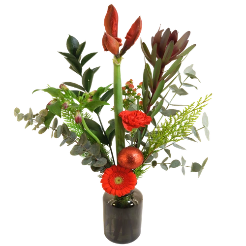 Kerstbloemen in het rood opgemaakt in een glazen vaas compleet kant en klaar geleverd in heel Nederland. Bestel op tijd voor de kerst. Thuiswinkel Lid.
