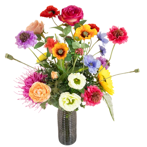 Een kant en klaar kunstbloemen Plukboeket direct zo neer te zetten in de huiskamer of ziekenhuis of een zakelijke omgeving.