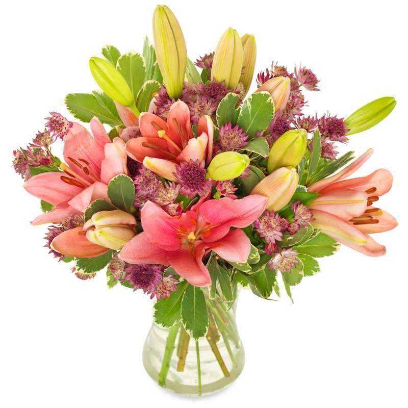 Een sterk en stralend boeket met deze kleurrijke roze lelies en paarse astrantia: symbolen van kracht en moed. Grote emoties met een klein prijskaartje.