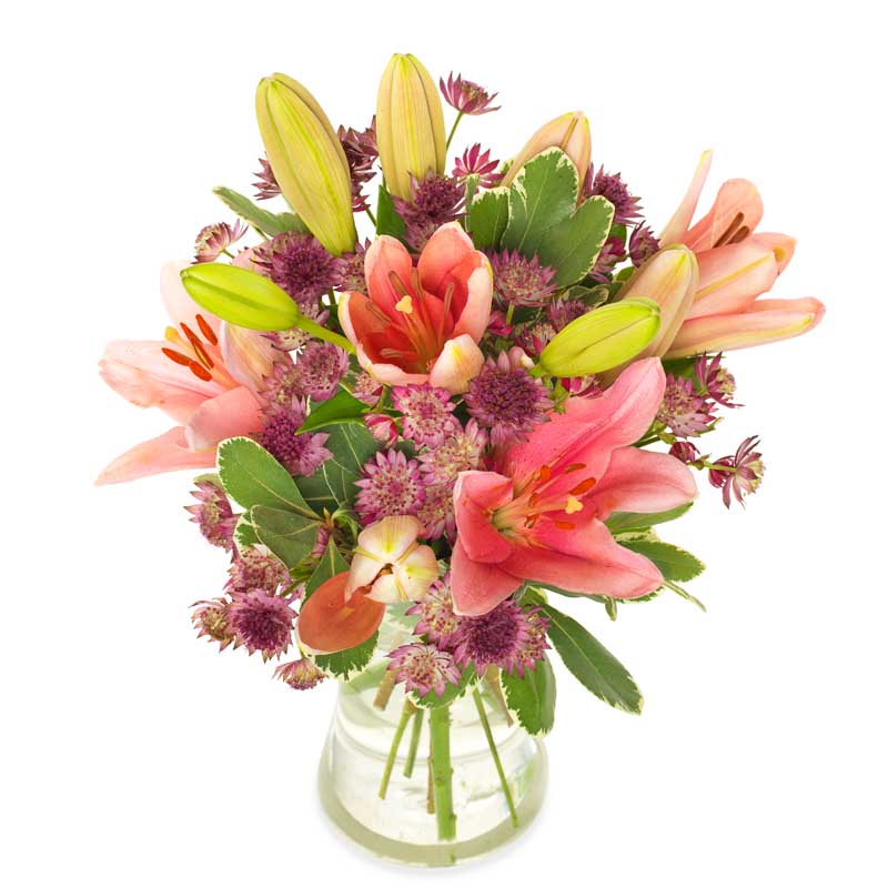 Een sterk en stralend boeket met deze kleurrijke roze lelies en paarse astrantia: symbolen van kracht en moed. Grote emoties met een klein prijskaartje.