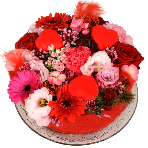 Een bloemetje… in de vorm van een taart is de ze Love bloementaart met o.a hartjes, rode en roze bloemen. De bloementaart wordt inclusief een glazen bord geleverd.