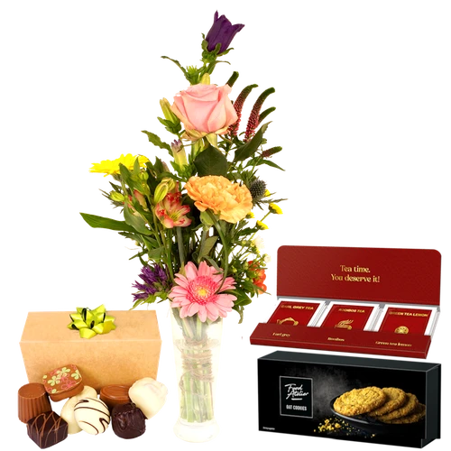 Een compleet cadeau van bloemen en lekkernijen. Samen bezorgd voor de ontvanger! Kies een wenskaartje met je persoonlijke boodschap voor de ontvanger.