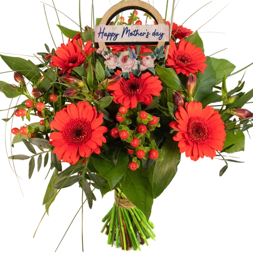 Moederdag bloemen boeket in rode kleuren zeer passend voor de gelegenheid. Beste eenvoudig en laat dit boeket op zondag op Moederdag bezorgen