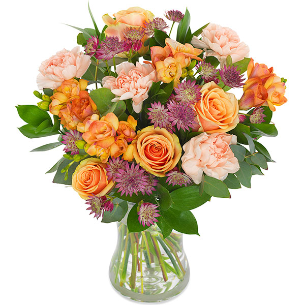 Zachte tinten roze en oranje om je warmste gevoelens te delen. Rozen en anjers tegen zachtmoedig groen zijn een prachtig teken van vriendschap. Dit boeket is een betaalbaar meesterwerk.