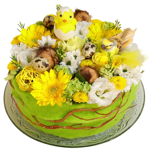 Een taart met bloemen in de sfeer voor Pasen. Een paas bloementaart in de kleuren geel en wit. Wie verras jij met pasen met deze paas bloementaart.