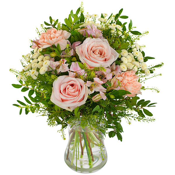 Toon je adoratie met dit schattige boeket. Zulke zachtroze en gele rozen en anjers glinsteren goddelijk: een geschenk van de goden, of van jou! Dit prachtige boeket kost niet veel, maar maakt hun dag gegarandeerd goed!