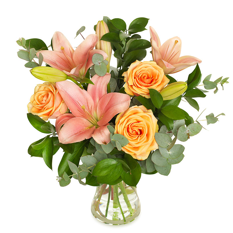 Roze en perzik zijn momenteel de populairste kleuren. Hier vertegenwoordigd door indrukwekkende lelies en prachtige rozen. Dit boeket is een veelzijdige keuze voor elke gelegenheid en biedt warmte, elegantie, visuele allure en betaalbare luxe.