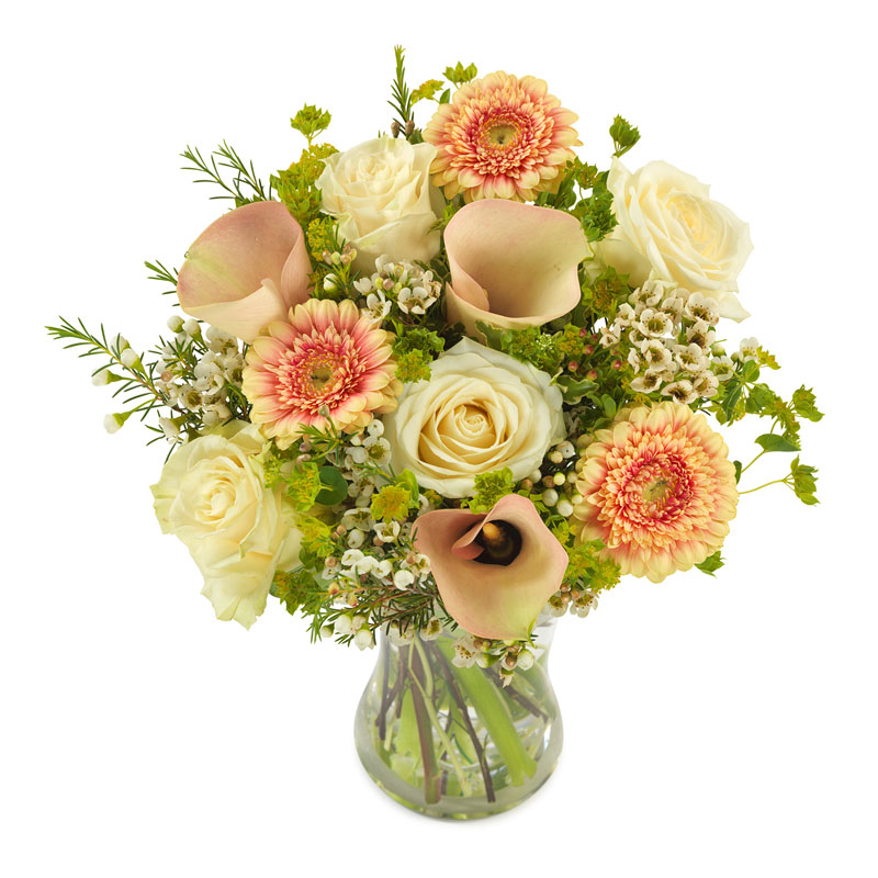 Als een zacht gefluister zijn de zachte perzikkleurige en gebroken witte tinten van dit boeket een elegante uitdrukking van liefde. Ervaar het plezier van het geven van handgebonden bloemen zoals rozen en gerbera’s. Boeketten waar de ontvanger blij van wordt. Prijzen waar de afzender blij van wordt.