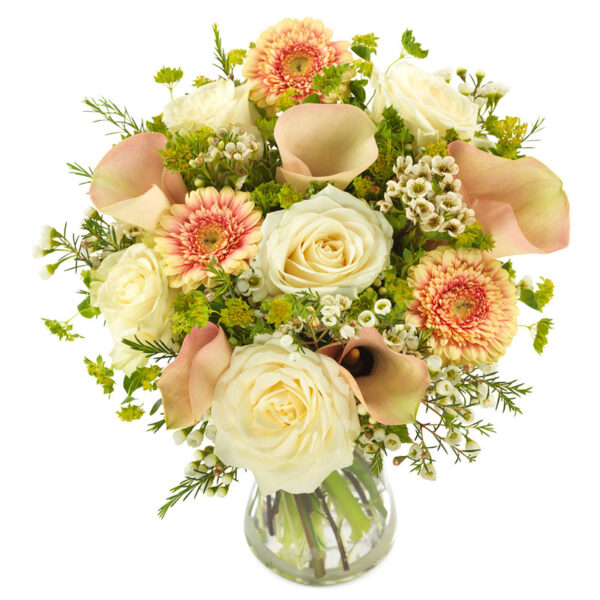 Als een zacht gefluister zijn de zachte perzikkleurige en gebroken witte tinten van dit boeket een elegante uitdrukking van liefde. Ervaar het plezier van het geven van handgebonden bloemen zoals rozen en gerbera’s. Boeketten waar de ontvanger blij van wordt. Prijzen waar de afzender blij van wordt.