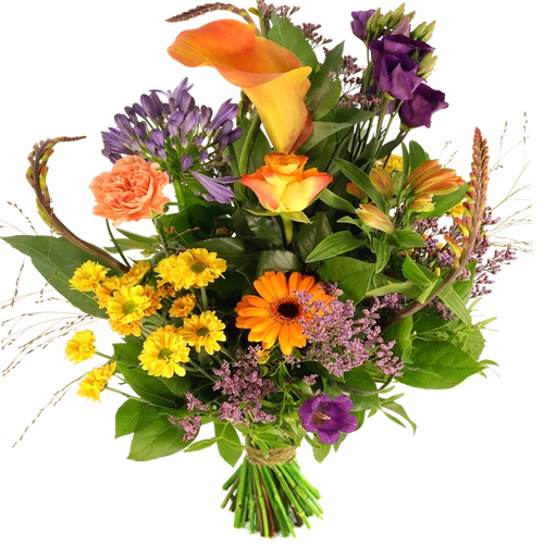 Een plukboeket in de vrolijke kleuren oranje en paars hoog laag gerangschikt. Een eye catcher voor de ontvanger. Bestel eenvoudig bij BoeketCadeau.nl