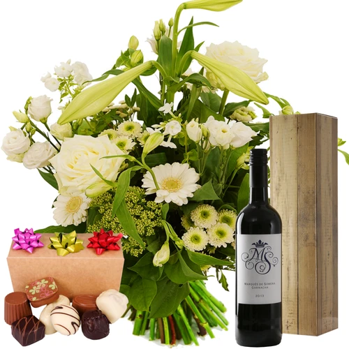 Witte verse bloemen een wit plukboeket voor Moederdag samen met heerlijke bonbons en een lekker flesje rode wijn laten bezorgen op Moederdag voor jouw moeder.