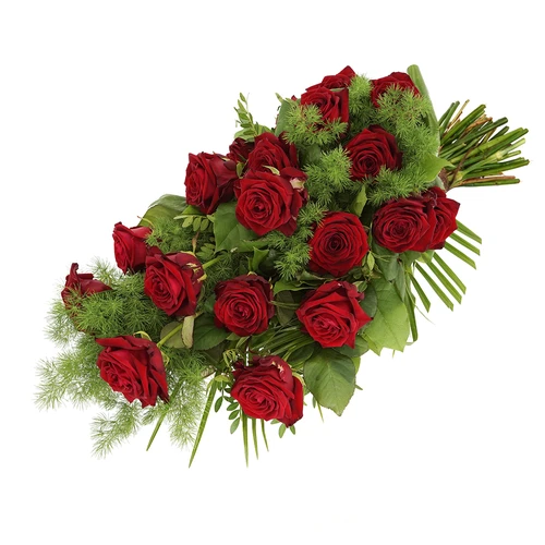 Rouwboeket rode rozen van ca. 60 cm lang. Rozen zijn echte begrafenisbloemen. Bezorgd in heel NL.