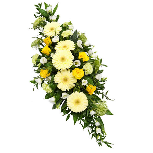 Lieflijk gele rozen, gerbera’s, lisianthus, anjers en akkerscherm voegen tere kleur toe aan dit rouwstuk. Herdenk op subtiele wijze de mooie herinneringen aan je naaste met dit liefdevolle eerbetoon.