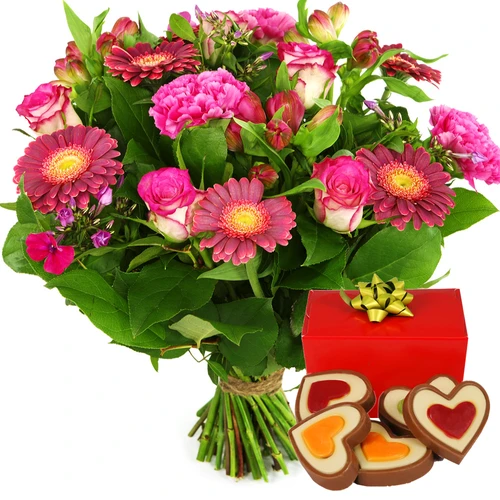 Boeket in de roze en donker roze tinten en overheerlijke romantische hartjes chocolade deze worden samen bezorgd in heel Nederland. 24/7 Bezorgd. Thuiswinkel Lid..