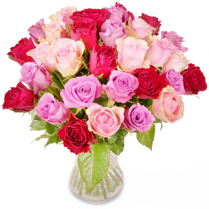 Romantisch rozenboeket met verse rozen (30-40 cm) in verschillende felle tinten roze en rood. Een perfect cadeau om een geliefde mee te verrassen. Eventueel uit te breiden met een doosje chocolade.