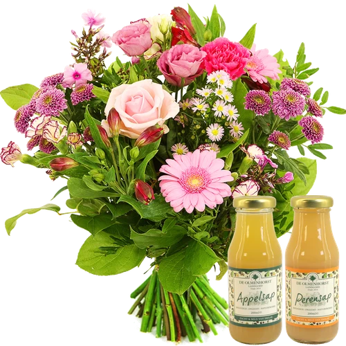 Een Seizoensboeket met roze bloemen van het seizoen samengesteld tot een mooi compositie en samen bezorgt met 2 heerlijke Olmenhorst Sappen. Thuiswinkel lid.