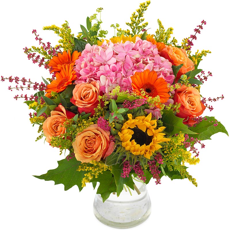 Een zomers en zonnig boeket dat op ieder gezicht een glimlach weet te toveren. Dit handgebonden boeket in warme schakeringen oranje, geel en roze wordt voor je samengesteld door een lokale bloemist. Verse bloemen voor een zacht prijsje.