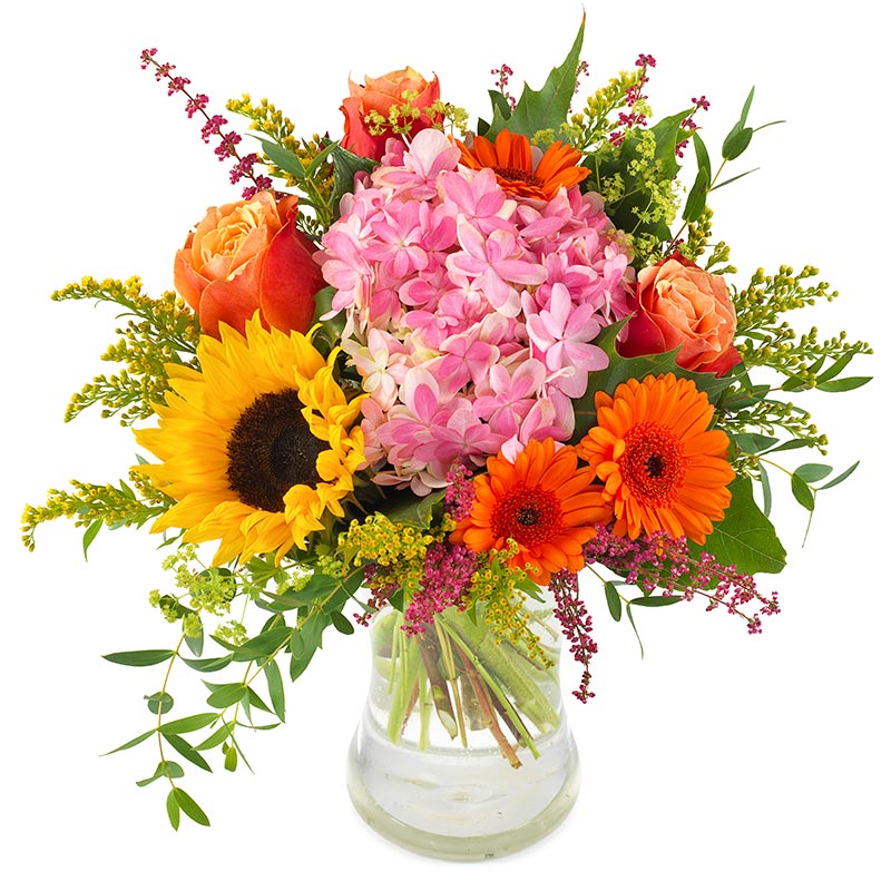 Een zomers en zonnig boeket dat op ieder gezicht een glimlach weet te toveren. Dit handgebonden boeket in warme schakeringen oranje, geel en roze wordt voor je samengesteld door een lokale bloemist. Verse bloemen voor een zacht prijsje.