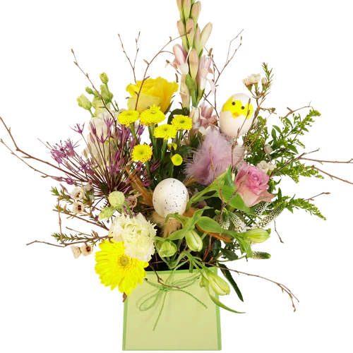 Mooie verse paasbloemen kant en klaar gerangschikt in een tasje, compleet afgeleverd bij de ontvanger. Versgarantie. Thuiswinkel Lid. Bestel op tijd.