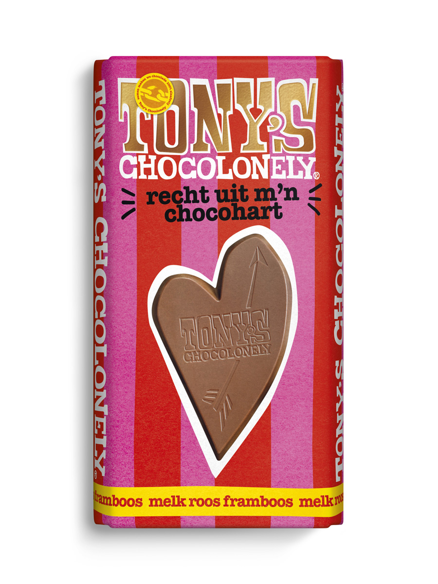 De melk-roos-framboos reep van Tony's Chocolonely. Welke chocolade past er nou beter bij een boeket rozen dan deze? Deze reep is dan ook het perfecte geschenk om aan je rozen toe te voegen. Maak je cadeau compleet met de chocolade van Tony Chocolonely. In het midden van de reep zit een hart. Je kunt de onverdeelde stukjes chocola om het hart afbreken om op te eten en dan houd je het chocolade-hart over!