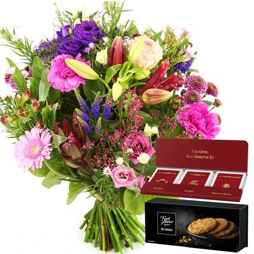 Veldgeplukte bloemen in een betoverend kleuren palet in het roze paars. Gebruik deze combi deal bloemen en koekjes en thee samen bezorgd. Thuiswinkel lid.