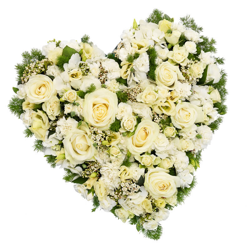 Deze hartvormige krans is een betekenisvolle herdenking van een naaste. De krans is opgemaakt met clusters van witte bloemen, waaronder rozen, anjers en lisianthus.