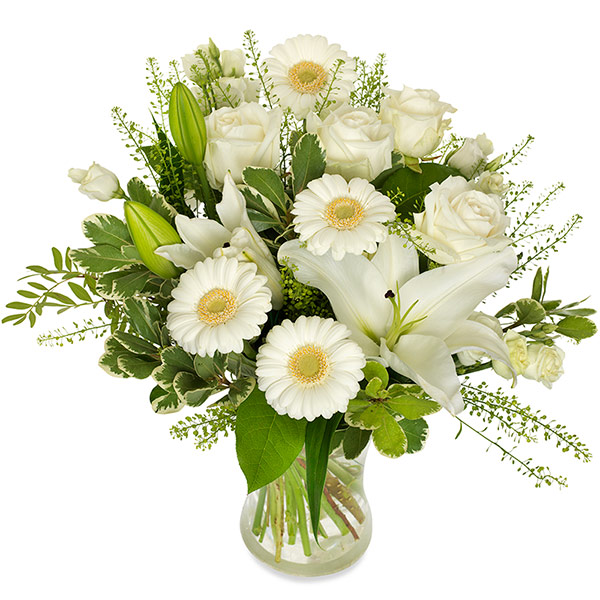 Een tijdloze mix van witte rozen en lelies voor een elegant gebaar. Een eenvoudige maar stijlvolle manier om te laten zien dat je om iemand geeft. Euroflorist zorgt ervoor dat je uitzonderlijke waarde ontvangt voor je gebaar en dat zonder verlies van elegantie en sentiment.