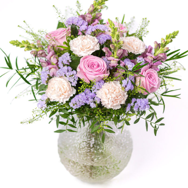 Zoet boeket met zachte lila leeuwenbekjes, zachte lila statice, roze rozen, crèmekleurige anjers, thlapsi en luchtig groen van het seizoen. Perfect voor verjaardagen, belangrijke jubilea en elke gelegenheid die het waard is om te vieren. Elke bloem is zorgvuldig geselecteerd om een boeket te creëren dat even mooi als betaalbaar is.