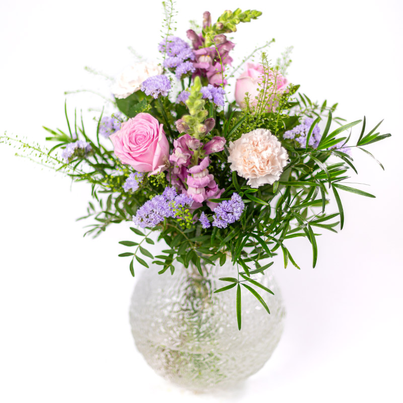 Zoet boeket met zachte lila leeuwenbekjes, zachte lila statice, roze rozen, crèmekleurige anjers, thlapsi en luchtig groen van het seizoen. Perfect voor verjaardagen, belangrijke jubilea en elke gelegenheid die het waard is om te vieren. Elke bloem is zorgvuldig geselecteerd om een boeket te creëren dat even mooi als betaalbaar is.