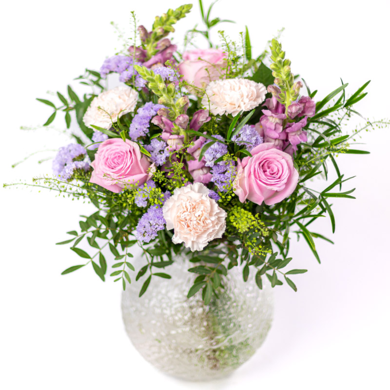 Zoet boeket met zachte lila leeuwenbekjes, zachte lila statice, roze rozen, crèmekleurige anjers, thlapsi en luchtig groen van het seizoen. Perfect voor verjaardagen, belangrijke jubilea en elke gelegenheid die het waard is om te vieren. Elke bloem is zorgvuldig geselecteerd om een boeket te creëren dat even mooi als betaalbaar is.