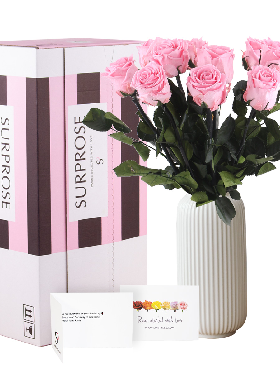 * Buiten direct zonlicht houden Het enige wat je hoeft te doen is te kiezen hoeveel rozen je zou willen versturen/ontvangen en eventuele stof na verloop van tijd van de roos halen. Verder hebben deze rozen geen verzorging nodig. Stuur de roze long life rozen naar iemand, en laat hem/haar voor een lange periode van de rozen genieten. Deze rozen kunnen namelijk maanden tot zelfs jaren lang mooi op de vaas blijven staan. Deze rozen worden, naast dat ze op de vaas staan, ook veelal gebruik als flowerbox. Ze worden dan in een hoedendoos geplakt en als eyecatcher in huis neergezet of weggeven. Is de ontvanger van de rozen van het knutselen en houdt de ontvanger van rozen? Dan is dit wellicht het perfecte geschenk. Voeg nog chocolade, wijn, champagne of een knuffel toe om jou cadeau helemaal compleet te maken. Geniet van de roze long life rozen van Surprose!