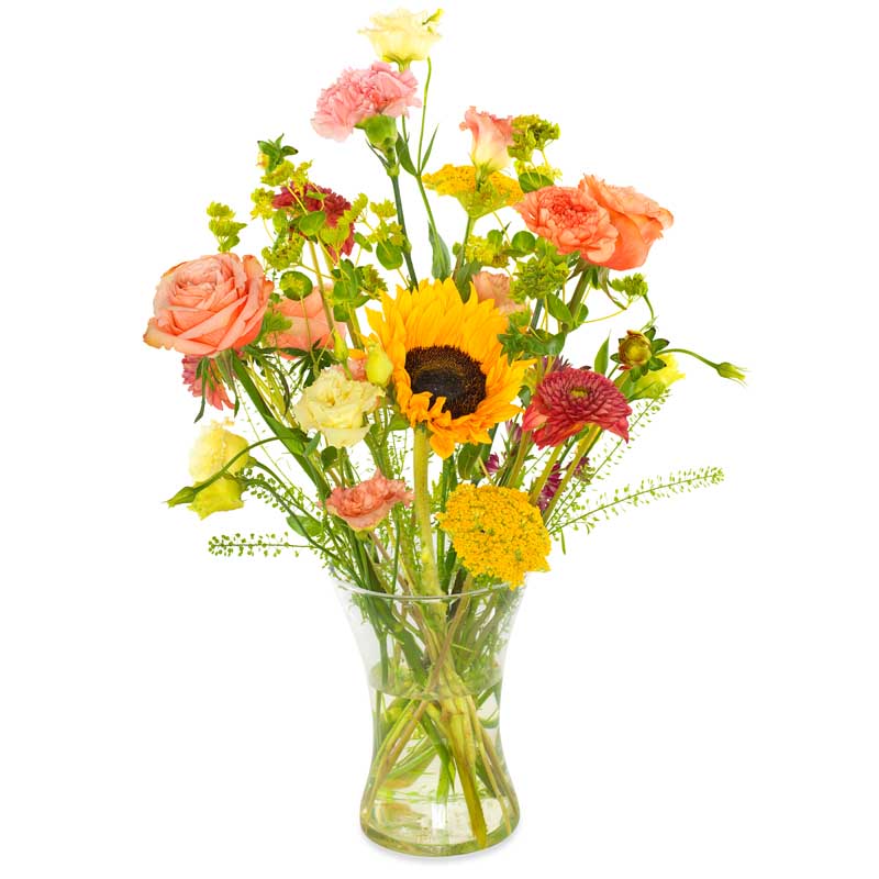 Geniet van de zomerse gloed van dit boeket met een gouden randje. Handgebonden zonnebloemen, rozen, lisianthus en anjers roepen de sfeer op van de zachte zomerzon. Geniet van goed geprijsde bloemen zonder kwaliteit op te offeren.